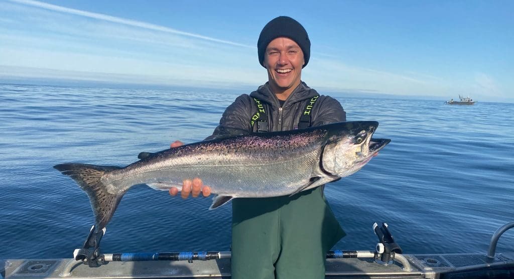 On July 10, the wind settled, and we were again free to range over the ocean. Kings remained dependable, halibut in our catches got much bigger, but the coho were still very spotty until the last weekend when they started showing in greater numbers. On the 14th some of our guests enjoyed the first silver limits of the year with ample numbers of kings in the mix. Since then, silver catches have ranged from half to full limits but for the past few days, the kings haven’t been mixing in with them. We are finding kings but in different locations than silvers.