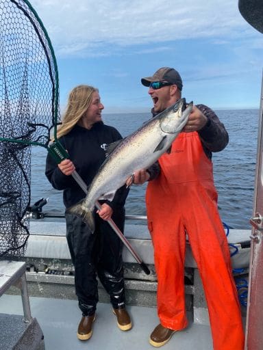 On July 14 – Captains Chuck and Tom enjoyed an excellent morning of fishing with office manager Bella and hostesses Katie, Annika, and Molly. Everyone landed a king and some silvers. Captain for the day, Bella ran the boat and netted the fish.