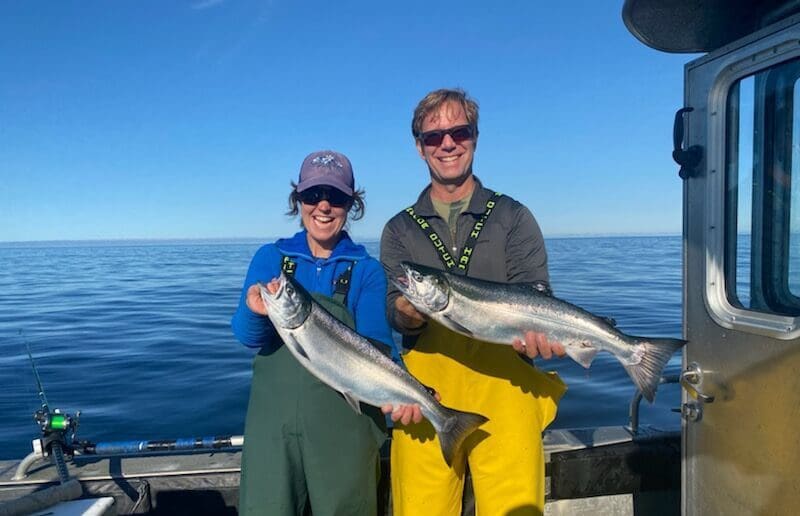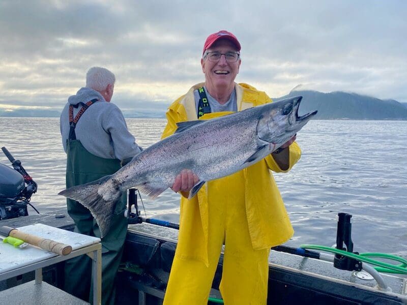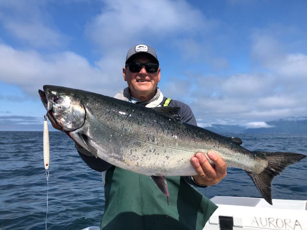 The weather doldrums settled on us for the second half of July with almost no wind, a flat calm ocean, and mild temperatures. The fishing has been anything but calm with big schools of silvers showing up, ample numbers of kings mixed in, a scattering of chums, and way too many pinks. Our guests can hardly put a bait down that doesn’t get bit. It’s just a matter of whether it’s the right kind of salmon. Catches of silvers have ranged from fast limits to all-day grinds that eventually add up to a good result. With the king limit at one per day and one per season, we haven’t had to target because we’re finding more than enough as we pursue the silvers. Halibut fishing has been fast and furious for chickens, but a bit more challenging for bigger fish on the offshore grounds. Rockfish continue to please and we’re seeing quite a few lingcod in the 30 to 35-inch slot size.