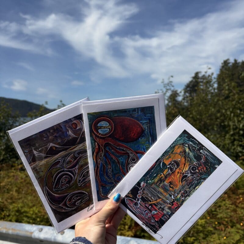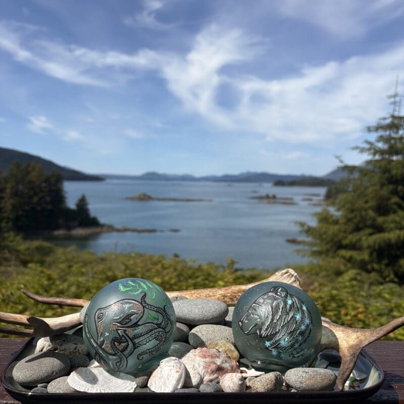 Ella Refshaw, daughter of Captain Ryan, specializes in decorating glass balls found locally or sourced from Sitka waters. While these items are not regularly stocked in the store, Ella is available for custom orders. Her artistic focus includes marine life such as fish, whales, and birds.