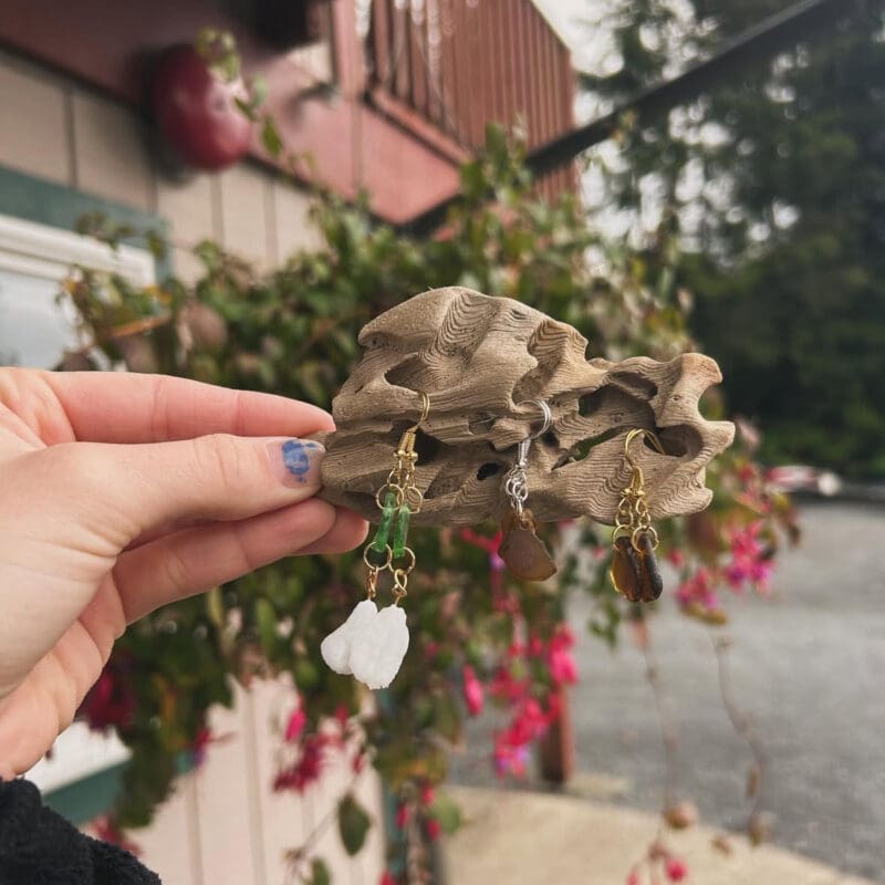 Madison Schmitz has dedicated the past two years to creating unique jewelry that’s available in our store. She uses locally sourced sea glass and otoliths (ear bones from fish). She collects sea glass during summer beachcombing excursions in Sitka, carefully selecting pieces to craft into earrings. Madison also produces earrings using otoliths harvested from fish processed on the AU dock. Most commonly, these are obtained from short raker rockfish or halibut, but she also offers custom pieces from any fish brought to the dock.