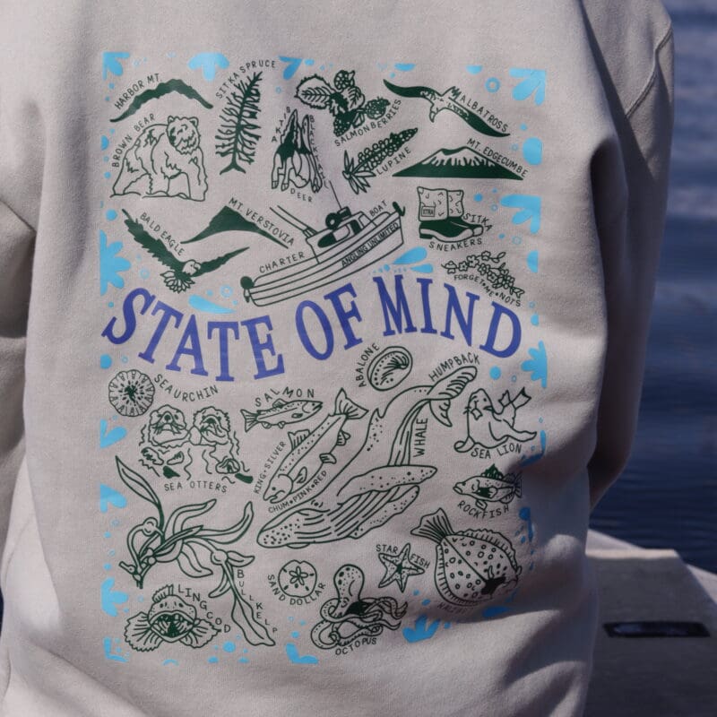 Hostess Addison Lindow has recently contributed to our store with a sweatshirt and t-shirt design created this past winter. Her artwork captures the essence of Sitka, featuring wildlife, natural scenery, mountains, and an AU boat. Addison meticulously hand-drew each “sticker” element before assembling them into the final composition. This exclusive design is now available in both t-shirts and crewnecks at the AU store.