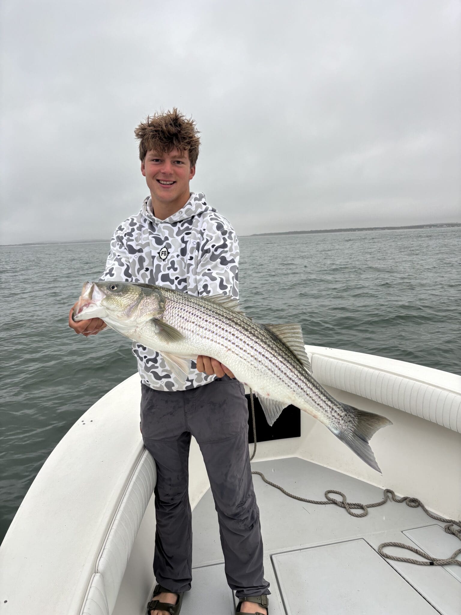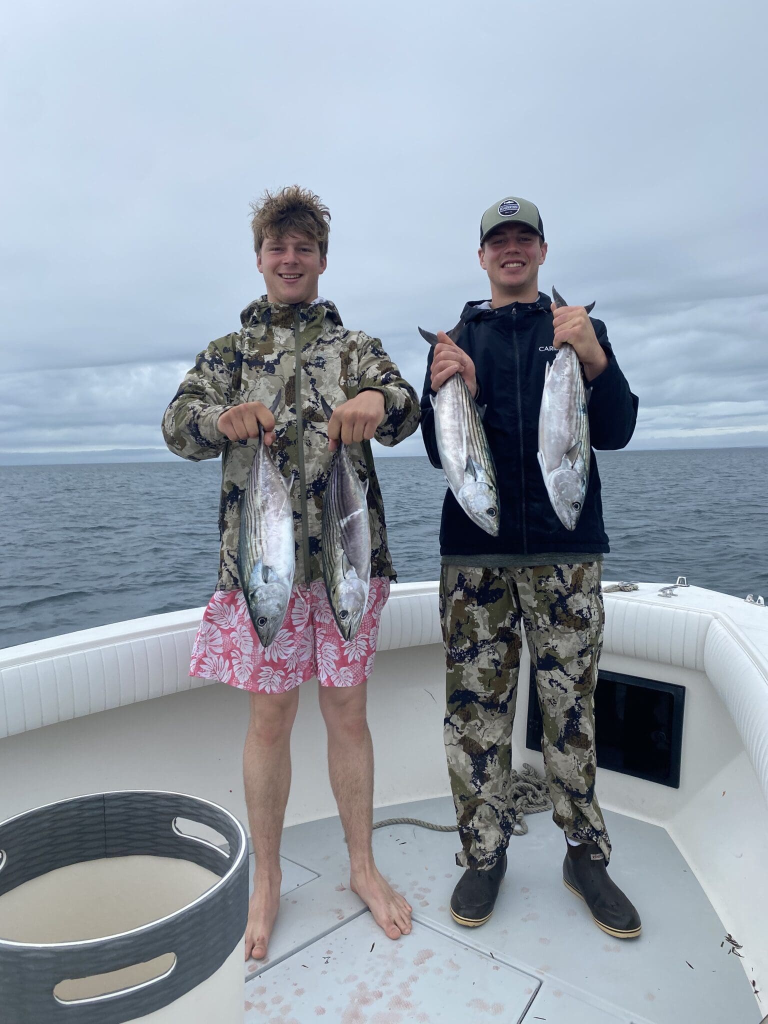 Captains Jack and Luke McNamee visited Captain Tom in Massachusetts in late September. The targets? Striped bass and funny fish (aka bonito and false albacore). They hit the ball out of the park with stripers up to nearly 30 pounds on light spin tackle and fly. On their last of four days, they ran into schools of bonito and check the funny fish box. The weather threatened to go bad, but never did. Going fishing to relax after a fishing season? What could be better?