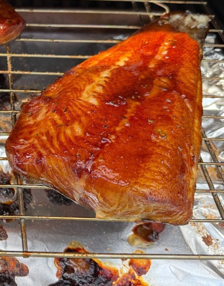 3. Place fish in smoker. Every 2 hours add a light layer of honey or teriyaki to fish.
