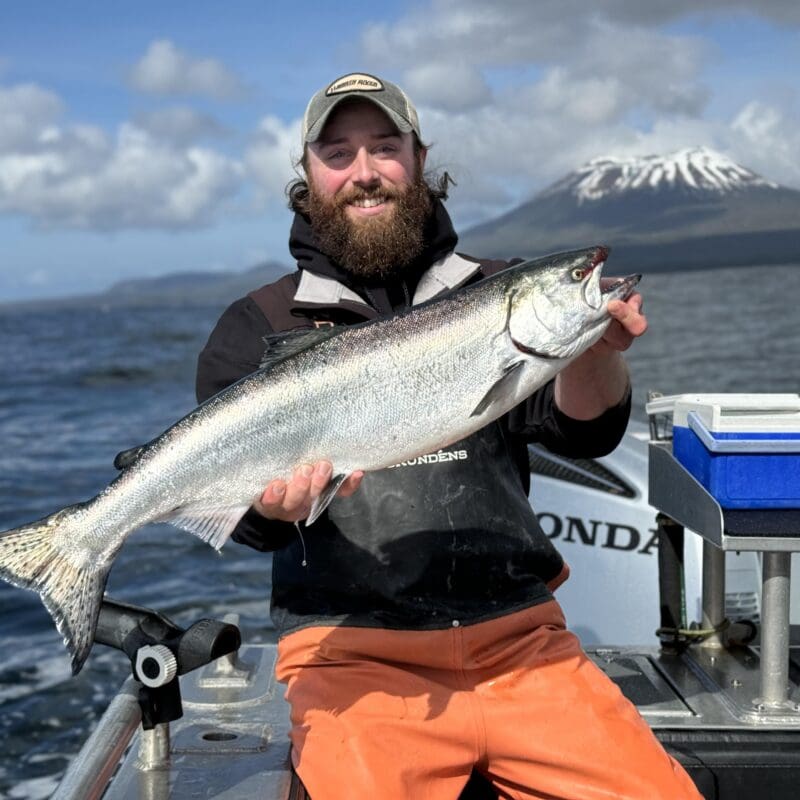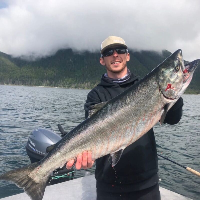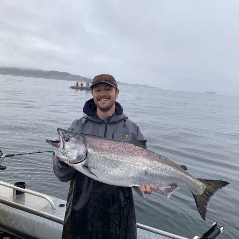 Spencer Chute Angling Unlimited crew member Spencer Chute smiles as he holds a large salmon