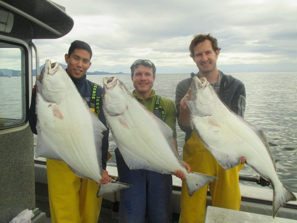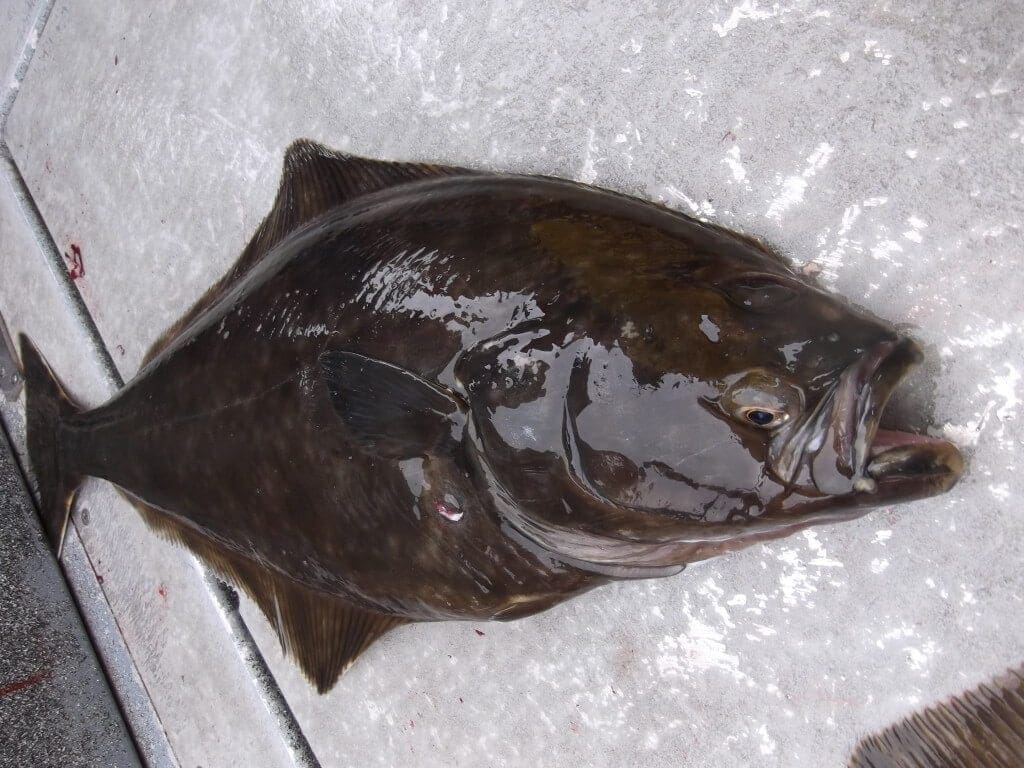 Pacific halibut belong to the family Pleuronectidae © the right sided flounders. California halibut, which we’ll get to some other time, have both eyes on the left side. Young halibut feed extensively on shrimp and small fish. As they grow, halibut turn more and more to a fish diet: cod, hake, sculpin, pollock, rockfish, lingcod, herring, candlefish (sand lance), and other flatfish, including small halibut. Additionally, they dine on the crabs, clams, squid, and octopus. I know of one 200 pound plus halibut landed in Neah Bay that had a lingcod of roughly 25 pounds in her belly. Halibut stick mainly to the bottom, but show no shyness about rising in the water column when the dining is right. The asymmetrical form of flatfish, though peculiar, is quite successful. Flatfish occupy niches in all oceans on the planet, from tropical to arctic. Halibut reign as kings of the flatties, reaching a maximum of nine feet in length and 700 pounds in both the Atlantic and Pacific. The vast majority of commercial and sport caught halibut range from 10 to 200 pounds. The females grow larger and live longer than the males, with few males exceeding 80 pounds. Any halibut over 100 pounds is a female. The oldest halibut on record is 55 years. Halibut have been managed by the International Pacific Halibut Commission since 1924. These fish are highly valued by sport and commercial fishermen alike.